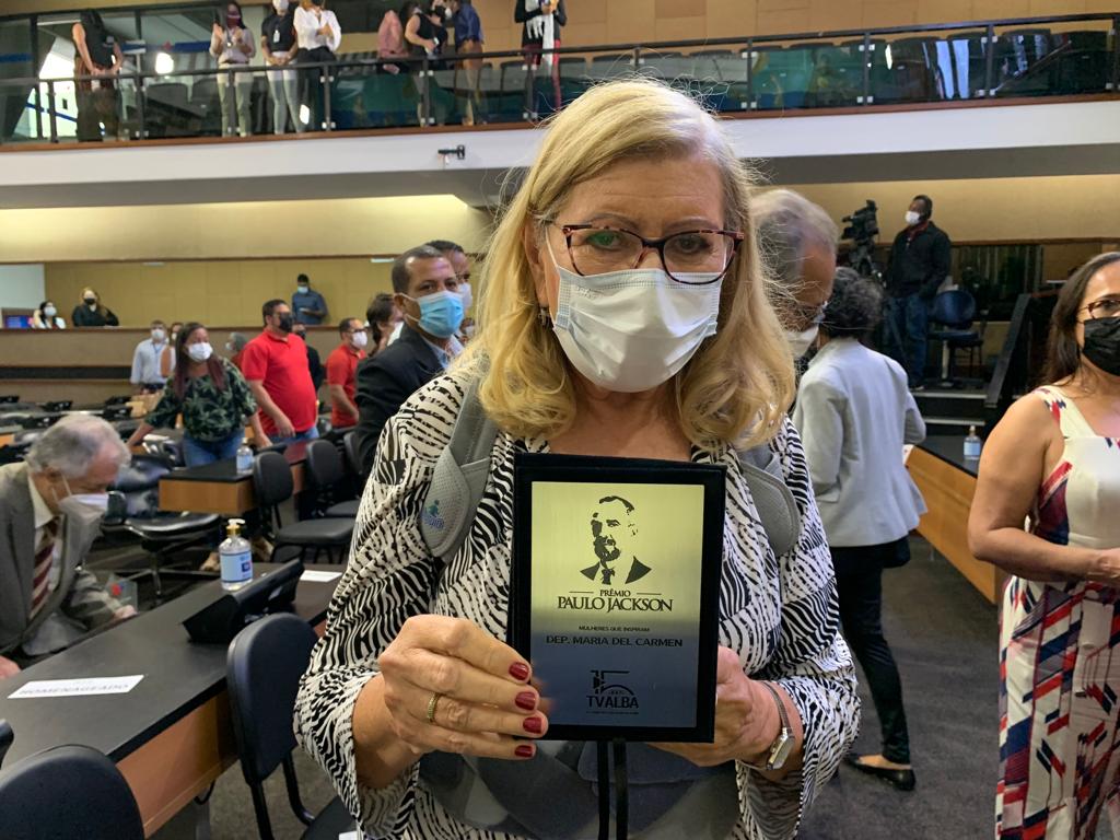 A deputada Maria del Carmen recebeu nesta quarta-feira (30), o Prêmio Paulo Jackson na categoria Mulheres que inspiram. A cerimônia de entrega aconteceu no Plenário da Assembleia Legislativa da Bahia, durante a sessão especial em homenagem aos 15 anos da TV ALBA.